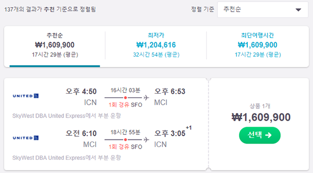 최단시간으로 갈 수 있는 노선은 샌프란시스코를 경유하여 16시간 3분이 걸리는 유나이티드 항공의 노선이 있으며 가격은 1,609,000원이다.