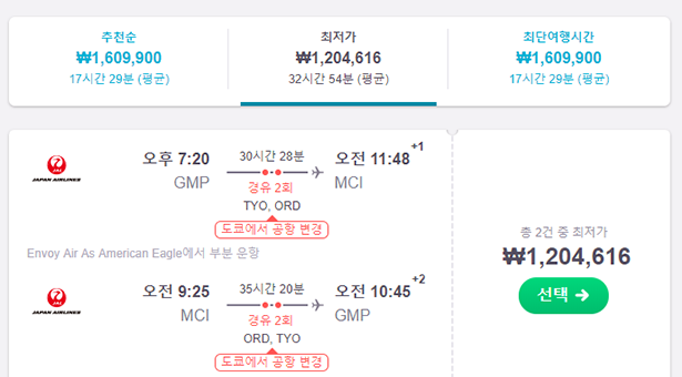최저가로 갈 수 있는 노선은 도쿄 하네다 공항과 시카고 공항을 2번경유하여 30시간 28분이 걸리는 일본항공의 노선으로 1,204,616원이다.