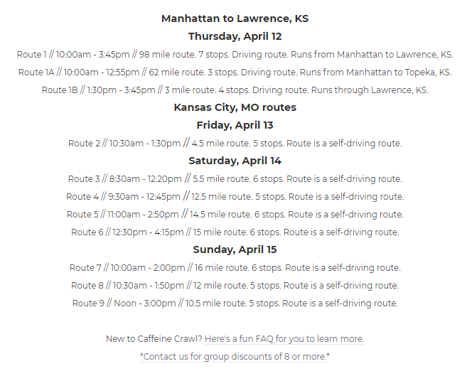 이 글에 커피 ‘축제’라는 단어를 사용하기 어려운 이유이기도 하다. 이벤트가 열리는 도시에서 해당 이벤트에 참여한 20여 곳의 커피, 음료 전문점을 정해진 코스에 따라 방문해 음료와 음식을 제공받는 방식이다. 한 코스당 5-6개의 stop이 있다. 제공되는 음료는 커피뿐 아니라 차, 초콜릿, 스콘, 사탕 등 매우 다양하다. 참고로 캔자스 카페인 크롤링은 1년에 2번을 나누어 진행한다. 행사 이름에 spring이 붙은 것은 이런 이유 때문이다.